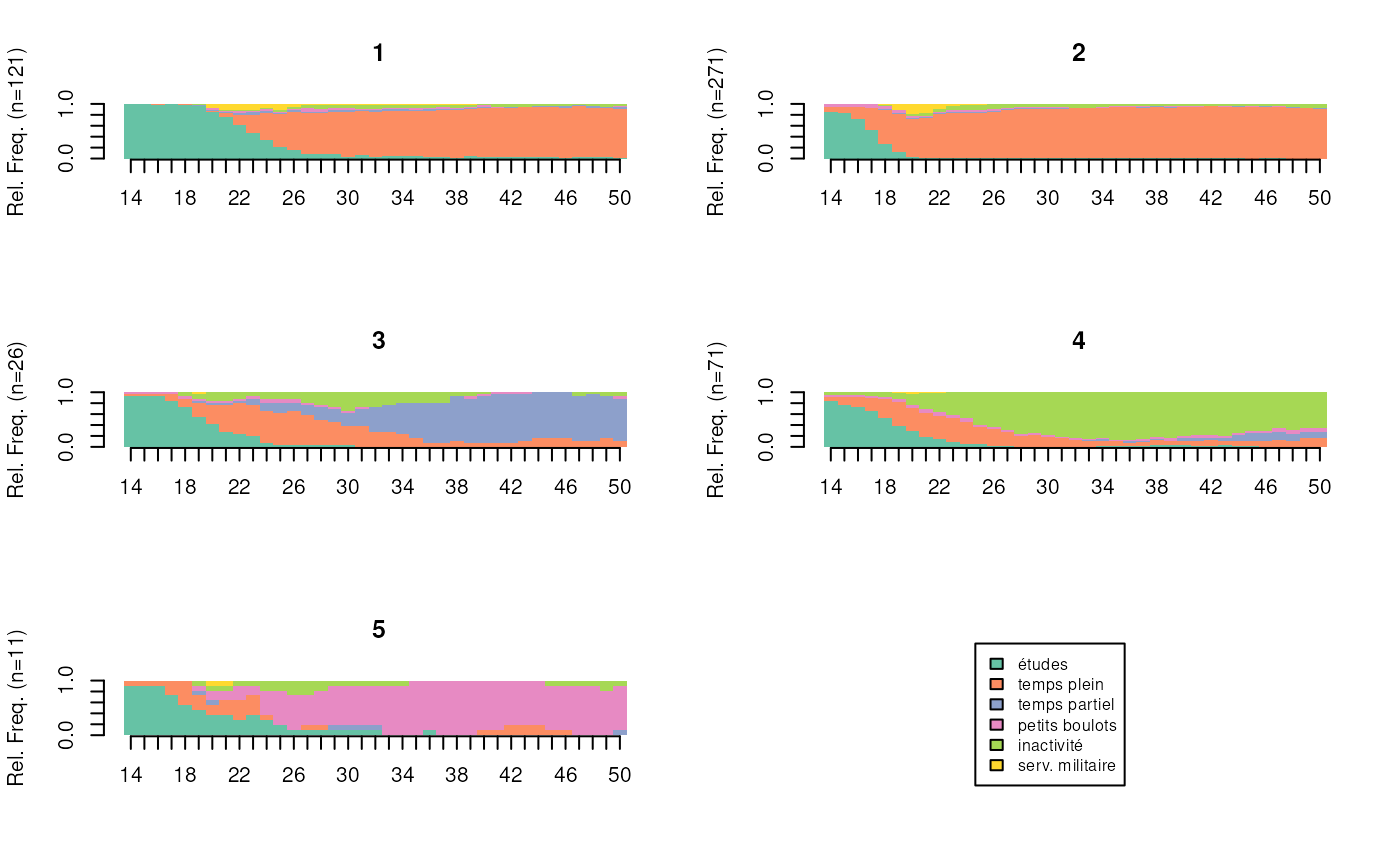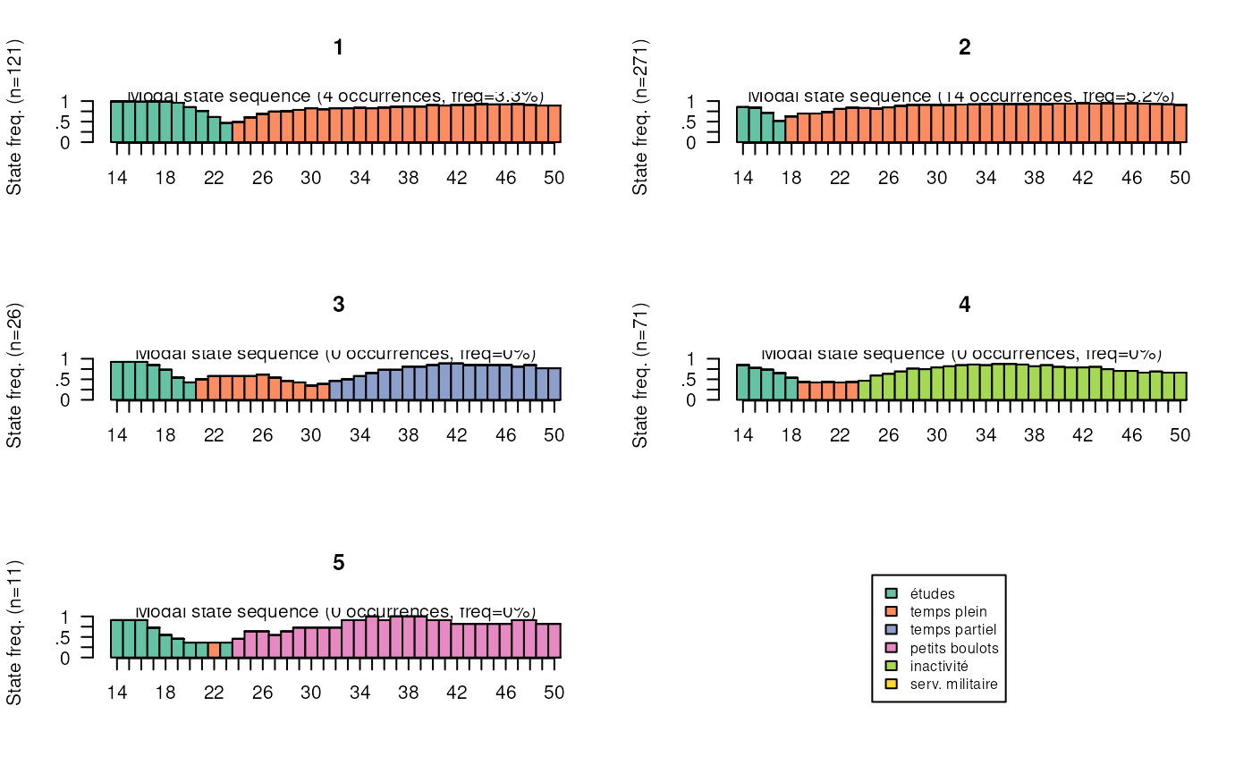 Le chronogramme (state distribution plot) de l’ensemble des séquences fait apparaître la prépondérance de l’emploi à temps plein et le poids non négligeable de l’inactivité.