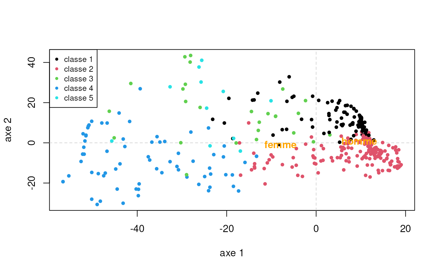 D <- (diff2(F)+diff2(G))^0.5On réalise ensuite une classification automatique (ici une CAH).